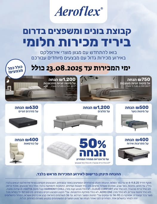 ימי מכירות מיוחדים : מ- 04.08.25 ועד 23.08.25 כולל